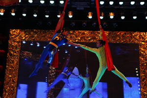 整場(chǎng)晚會(huì)以興業(yè)集團(tuán)成立10周年走過的光輝歲月為主線,在興發(fā)公司選送的歌伴舞《吉祥頌》中拉開了帷幕,伴隨著激越的鼓點(diǎn)、歡快的舞蹈、喜悅的歌聲,霎時(shí),千米演播大廳成為了歡樂的海洋。興業(yè)房產(chǎn)公司選送的歌舞《紅旗飄飄》、《愚公移山》,唱出了興業(yè)人對(duì)偉大祖國的熱愛和百折不撓的創(chuàng)業(yè)精神;興業(yè)汽配公司選送的《前門情思大碗茶》京味十足,集團(tuán)機(jī)關(guān)選送的原生態(tài)陜北民歌《山丹丹花開紅艷艷》和青春奔放的流行歌曲《改變自己》,展現(xiàn)了興業(yè)人多才多藝的時(shí)代風(fēng)采;天泰鋼構(gòu)公司田雯雯一曲《美麗心情》抒發(fā)了興業(yè)人對(duì)美好生活的熱愛和追求;房產(chǎn)公司姑娘們表演的富有濃郁民族特色的新疆舞《西域風(fēng)情》,勾起觀眾對(duì)邊疆風(fēng)情的片片遐想。集團(tuán)機(jī)關(guān)創(chuàng)作的配樂詩朗誦《興業(yè)十年頌》和音樂群口快板《說唱興業(yè)房產(chǎn)》,讓全場(chǎng)觀眾打開記憶之門,重溫了興業(yè)集團(tuán)10年的發(fā)展歷程,更是喚醒了興業(yè)人強(qiáng)烈的歷史使命感和自豪感,迸發(fā)出一股強(qiáng)大的自我升華的豪邁激情。青島永杰的姑娘們帶來的《激情水鼓》,奏響迎春盛典,震耳欲聾的鼓聲配合激昂的音樂,水花飛濺,光芒四射,引爆全場(chǎng)激情。友誼商店的姑娘們表演的運(yùn)動(dòng)時(shí)裝秀和社區(qū)老年人表演的太極功夫扇《夕陽美》,活力十足的青春魅力與剛?cè)岵?jì)的白發(fā)矍鑠,演繹出了一幅興業(yè)大家庭的和諧美景。公司選送的小品《風(fēng)波》和興發(fā)公司選送的山東快書《大老郭趕春晚》,情趣交融,令人捧腹,反映出了當(dāng)代建筑工人的情感世界和興業(yè)人對(duì)企業(yè)的無限熱愛之情。雜技《夢(mèng)幻藍(lán)綢》驚險(xiǎn)刺激,動(dòng)人心魄,引起場(chǎng)下觀眾陣陣驚呼。當(dāng)全場(chǎng)觀眾期待已久的北京《OOB美少女組合驚艷亮相時(shí),場(chǎng)下掌聲雷動(dòng),歡呼一片,動(dòng)感十足的青春美少女用她們的成名作《地球媽媽》和一首《心想事成》,甜歌勁舞,征服了全場(chǎng)觀眾,再掀晚會(huì)新高潮。“山一樣的氣魄,海一樣的魂,春天里走來了興業(yè)人”,伴隨著晚會(huì)主題歌曲《興業(yè)春天》的響起,《興業(yè)春天》興業(yè)集團(tuán)2010年春節(jié)聯(lián)歡晚會(huì)華彩落幕。